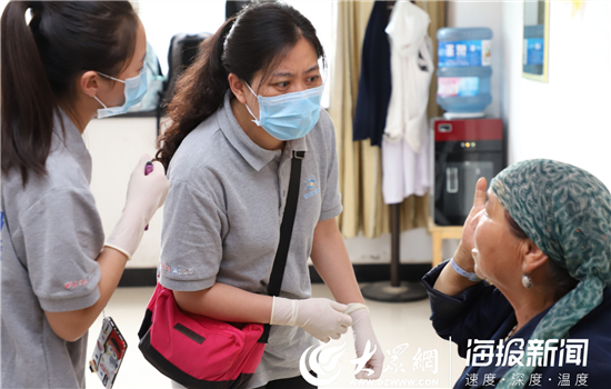 志愿者棗莊市市中區人民醫院眼科主任湯靜觀察患者眼部情況。(仇晶 攝)
