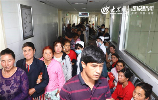 8月23日早上10時許,英吉沙縣人民醫院門診樓4樓的半層通道已經擠滿患者,看到身著印有“天涯若比鄰,魯疆一家親”字樣T恤的醫療專家們出現,等待的人群一陣騷動,沒一會,眼科門診前就聚起了長隊。