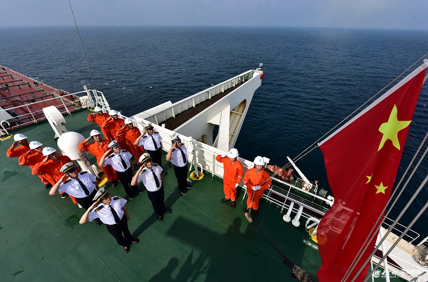 2019年6月22日,正在黃海上航行的25萬噸級散貨船“山東人和”輪舉行消防演習,同時,船員們也向記者展示了真實的海員工作和生活場景。“山東人和”輪海員們舉行升旗儀式。