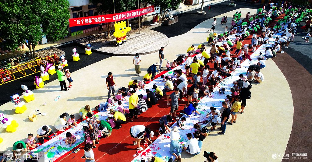 9月12日,浙江省臺州市仙居縣官路鎮(zhèn)中心幼兒園舉行“百個故事頌祖國”為主題的親子百米長卷繪祖國活動(無人機拍攝)。