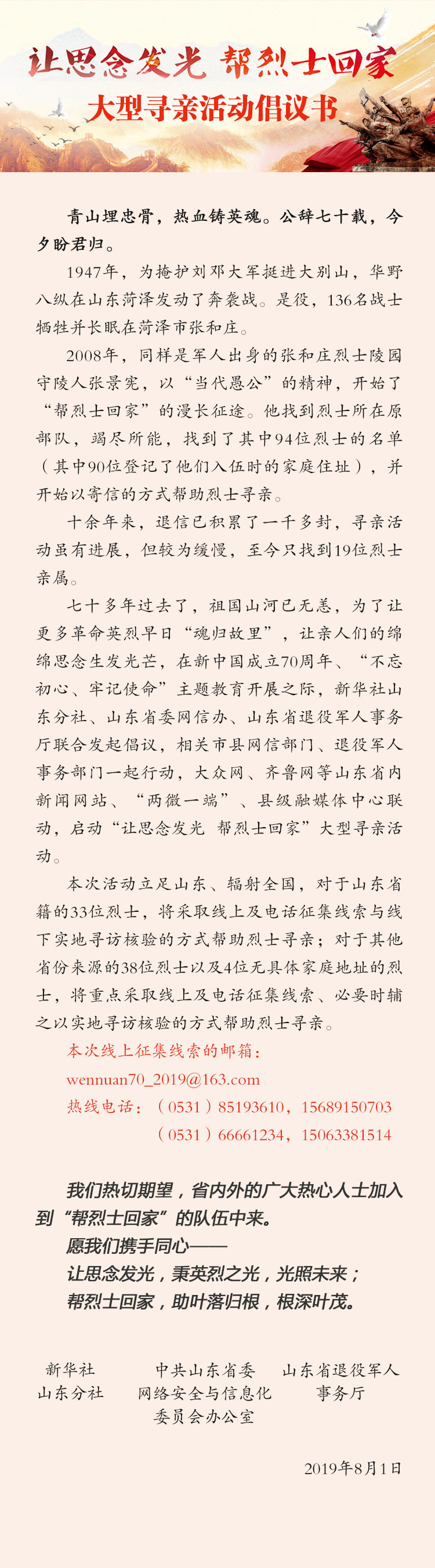 “讓思念發(fā)光 幫烈士回家”大型尋親活動(dòng),由新華社山東分社、山東省委網(wǎng)信辦、山東省退役軍人事務(wù)廳聯(lián)合發(fā)起倡議,相關(guān)市縣網(wǎng)信部門、退役軍人事務(wù)部門一起行動(dòng),大眾網(wǎng)、齊魯網(wǎng)等山東省內(nèi)新聞網(wǎng)站、“兩微一端”、縣級融媒體中心聯(lián)動(dòng)。本次活動(dòng)立足山東、輻射全國,對于山東省籍的33位烈士,將采取線上及電話征集線索與線下實(shí)地尋訪核驗(yàn)的方式幫助烈士尋親;對于其他省份來源的38位烈士以及4位無具體家庭地址的烈士,將重點(diǎn)采取線上及電話征集線索、必要時(shí)輔之以實(shí)地尋訪核驗(yàn)的方式幫助烈士尋親。