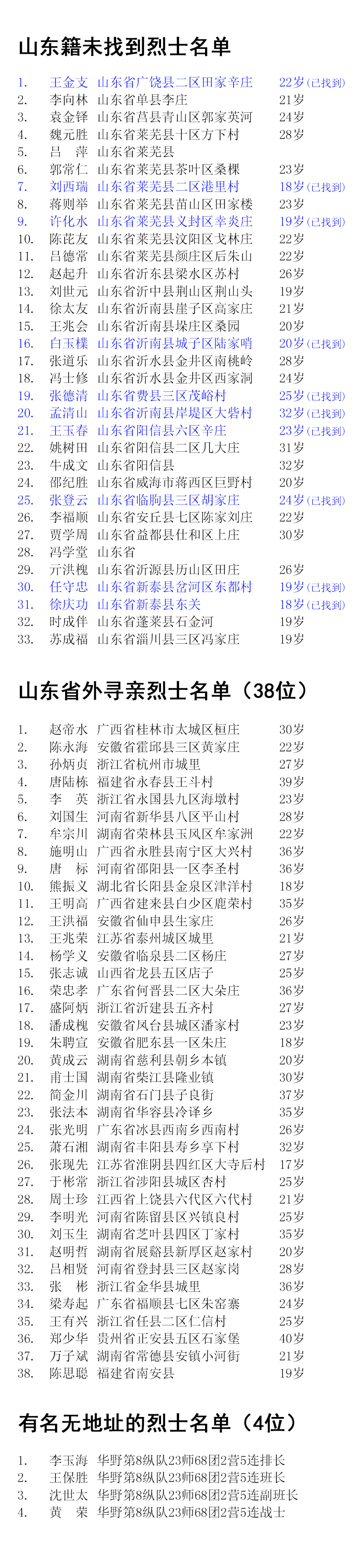 記者統計發現,倡議發出6天來,在山東籍未找到的33名烈士名單中,已有任守忠(活烈士)、徐慶功(實為徐勤功)、姚樹田(實為姚吉田)、王玉春、張登云、許化水(活烈士)、白玉檏、張德清、王金支、劉西瑞10名烈士找到家鄉和親人。另外,還找到時成伴、張道樂、劉世元、馮士修等山東籍烈士的親屬線索信息。