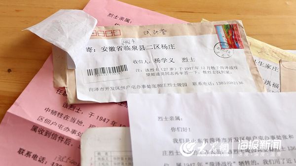 “楊學義烈士犧牲在我們菏澤了,今天我來把這消息給你們送來了!”在楊學義的侄子楊井賀的家中,張景憲為烈士親屬們讀了“尋親信”的內容。楊學義烈士的親屬心情激動,在現場不住地擦眼淚。