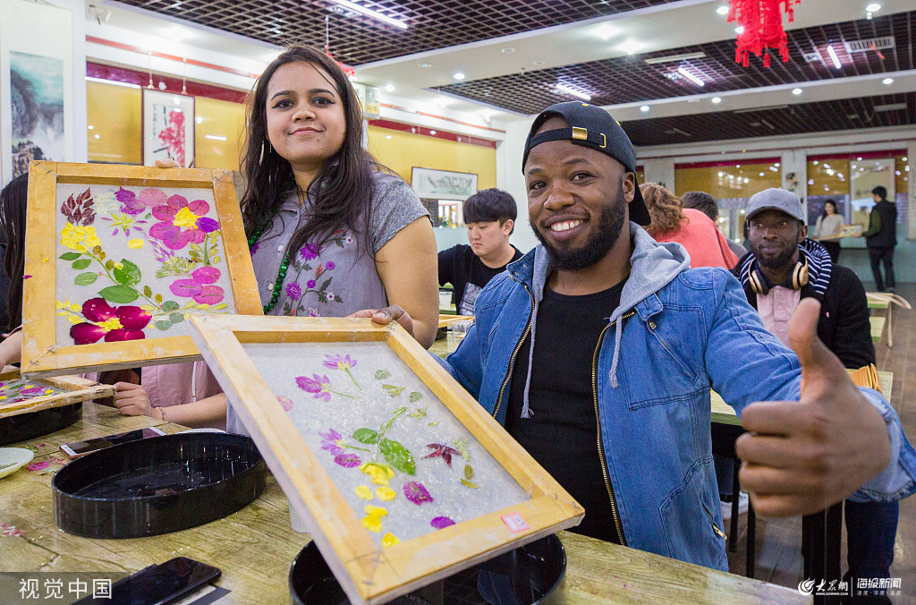 留學生在呼和浩特市玉泉區大漠文化創意園展示自己制作的花草紙。