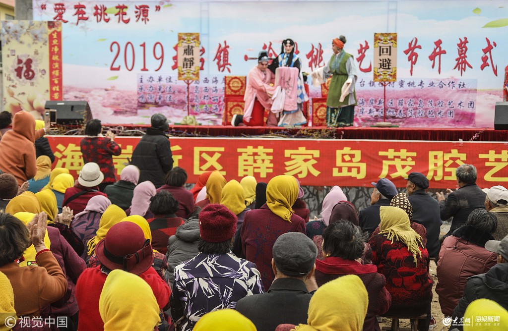 2019年4月8日,青島西海岸新區(qū)王臺(tái)鎮(zhèn)徐村正在舉辦的桃花源藝術(shù)節(jié)上,請(qǐng)來(lái)了享譽(yù)當(dāng)?shù)氐拿粍F(tuán)為村里的父老鄉(xiāng)親捧現(xiàn)了《羅衫記》、《墻頭記》等膾炙人口的茂腔大戲,鄉(xiāng)親們呼朋喚友在家門(mén)口觀賞其樂(lè)融融。