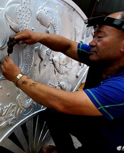 2019年8月20日,山東濱州鄒平市黛溪街道城里村尚紅生在金屬板上雕刻作品。近日,尚紅生正在加班加點(diǎn)雕刻“盛世多福壽”、“九福捧壽”兩幅作品準(zhǔn)備參加第八屆山東省文博會(huì)。 [詳細(xì)]