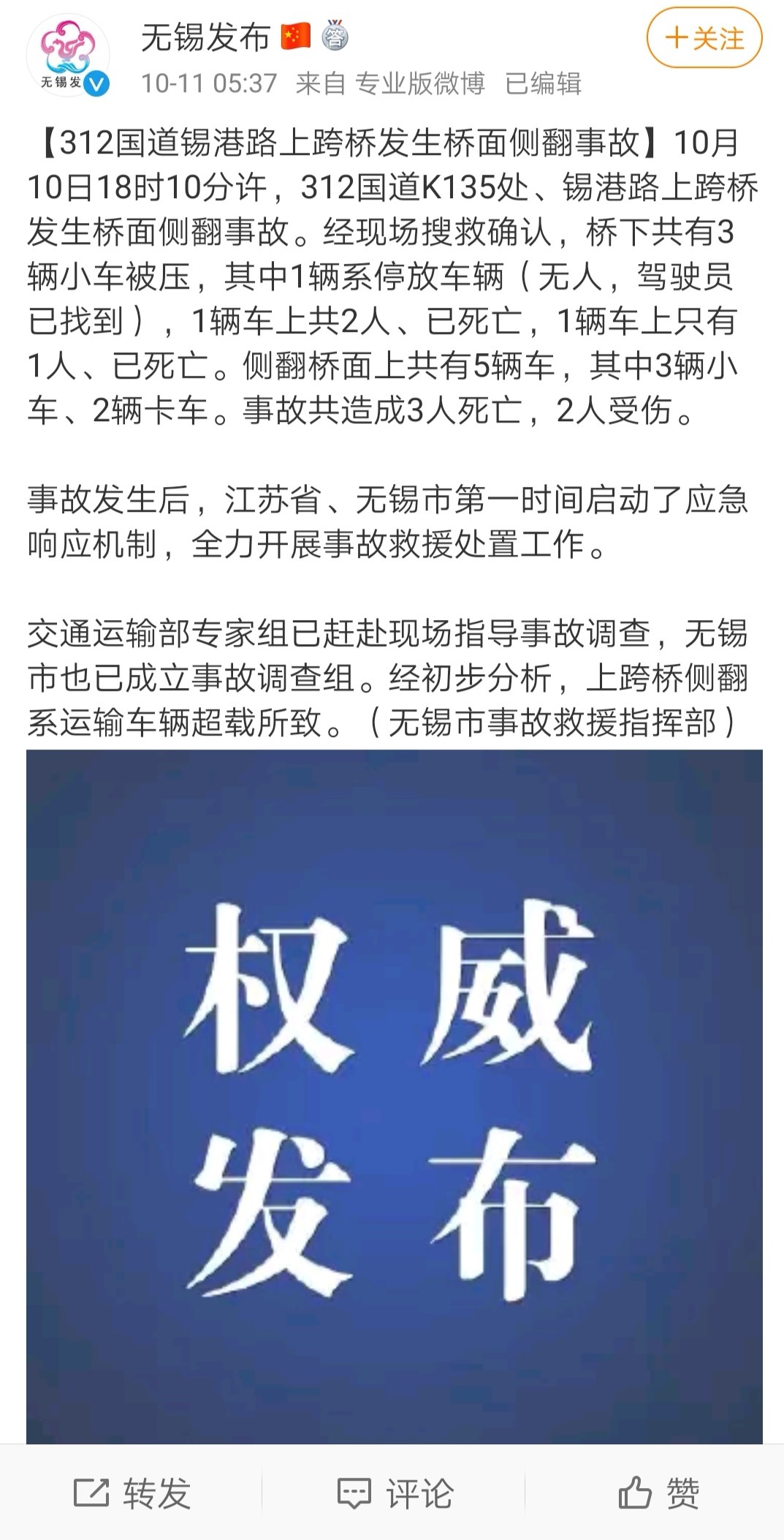 10日的高架橋傾覆事故后,無錫市政府新聞辦在11個小時后發布了第一條情況通報稱,經初步分析,312國道K135處、錫港路上跨橋發生橋面側翻事故系運輸車輛超載所致。