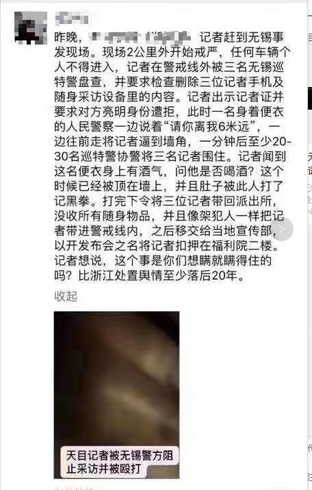 記者注意到,有來自浙江某媒體的記者在朋友圈發文稱,自己遭到無錫巡特警、協警的毆打,并被當地宣傳部門“扣押”起來,并配有一段視頻。