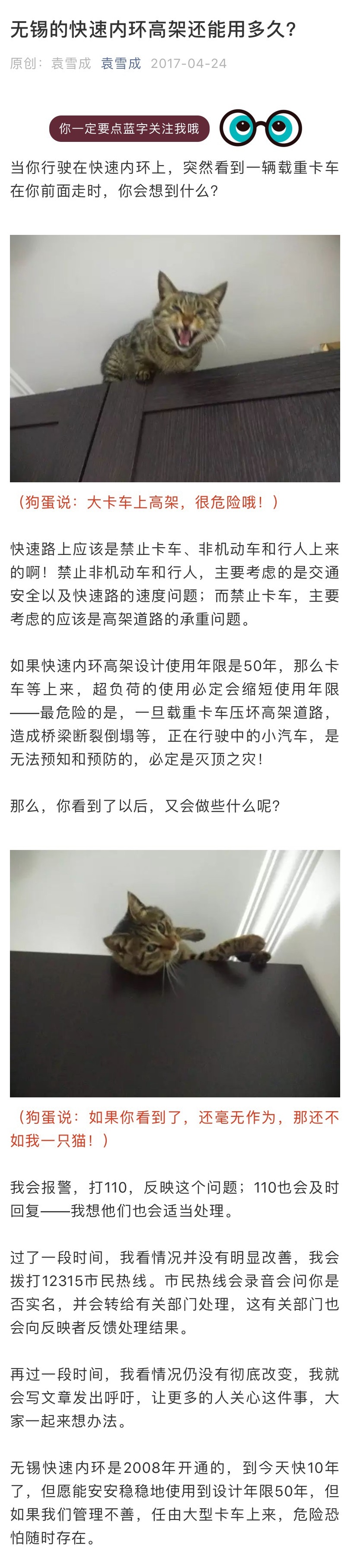實際上,對于卡車駛上高架橋,早就有自媒體發文對其中的安全隱患表示擔憂。自媒體賬號袁雪成2017年發布的一篇《無錫的快速內環高架還能用多久?》在此次事故的當晚就開始刷屏,文中說,一旦載重卡車壓壞高架道路,造成橋梁斷裂倒塌等,正在行駛中的小汽車,是無法預知和預防的必定是滅頂之災。