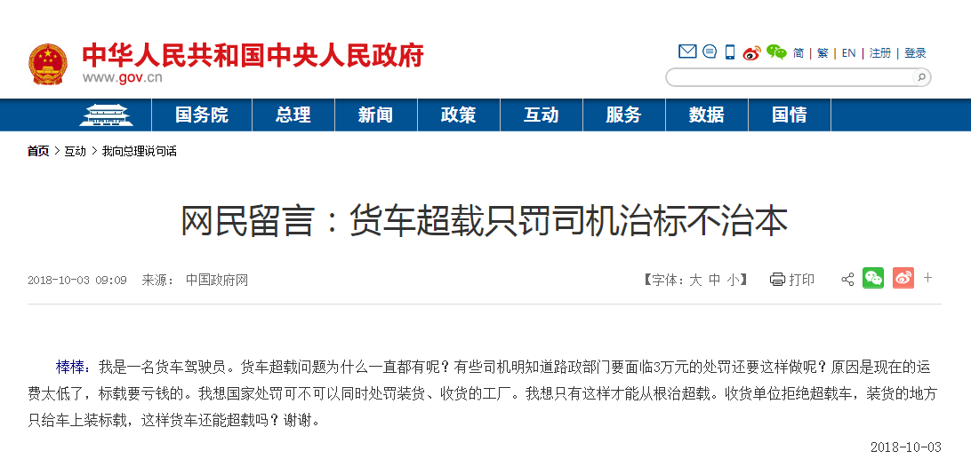 而對于解決貨車超載問題,記者注意到,2018年曾有自稱貨車駕駛員的網民在中國政府網上留言稱,貨車超載只罰司機治標不治本。這位網友說,“貨車超載問題為什么一直都有呢?有些司機明知道路政部門要面臨3萬元的處罰還要這樣做呢?原因是現在的運費太低了,標載要虧錢的。我想國家處罰可不可以同時處罰裝貨、收貨的工廠。我想只有這樣才能從根治超載。收貨單位拒絕超載車,裝貨的地方只給車上裝標載,這樣貨車還能超載嗎?”