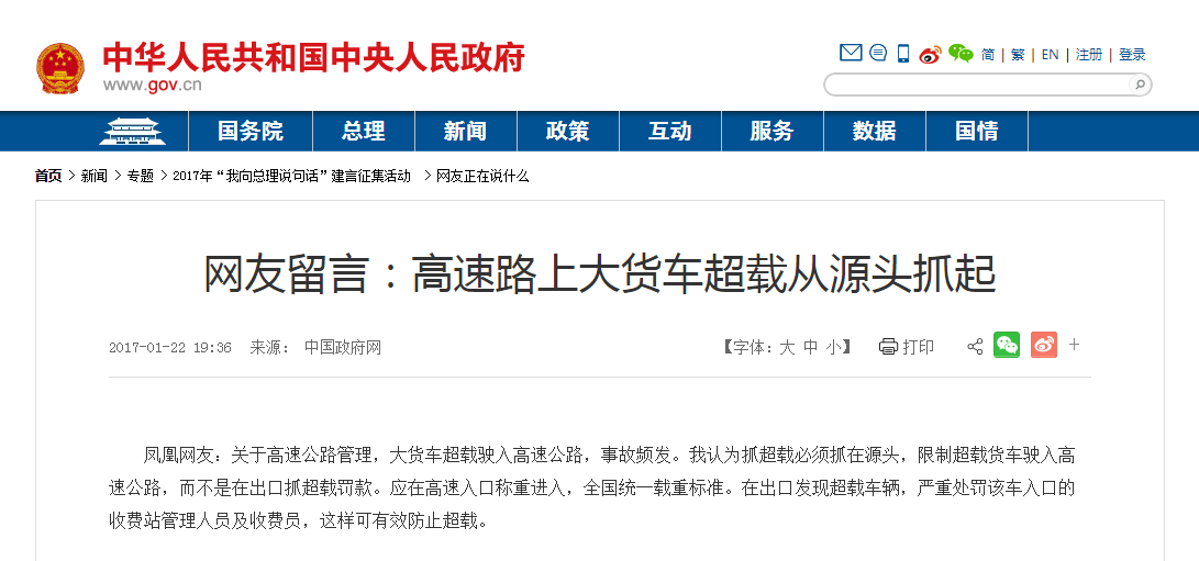 此前,2017年也曾有網友在中國政府網上留言稱,“我認為抓超載必須抓在源頭,限制超載貨車駛入高速公路,而不是在出口抓超載罰款。應在高速入口稱重進入,全國統一載重標準。在出口發現超載車輛,嚴重處罰該車入口的收費站管理人員及收費員,這樣可有效防止超載。”