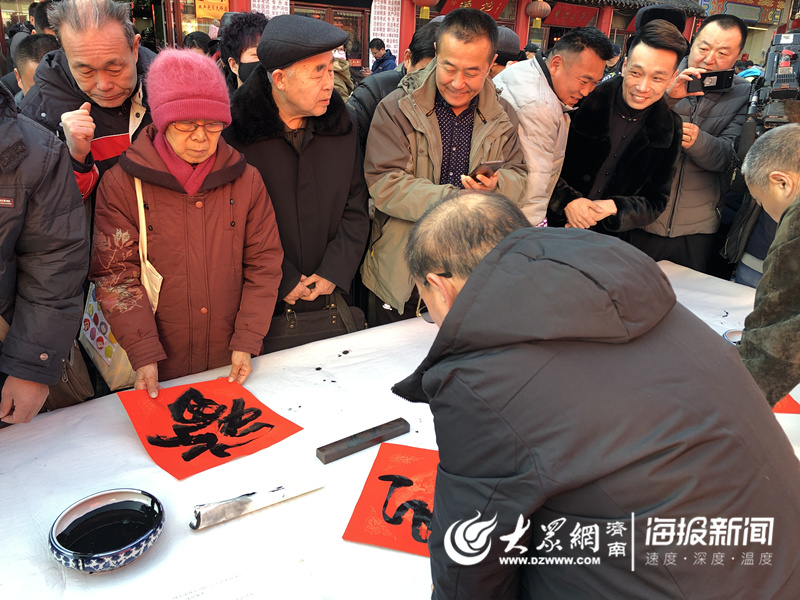 英雄山文化市場準備了豐富多彩的民俗活動回饋市民,十幾名書法家為市民免費寫福字和春聯(lián)