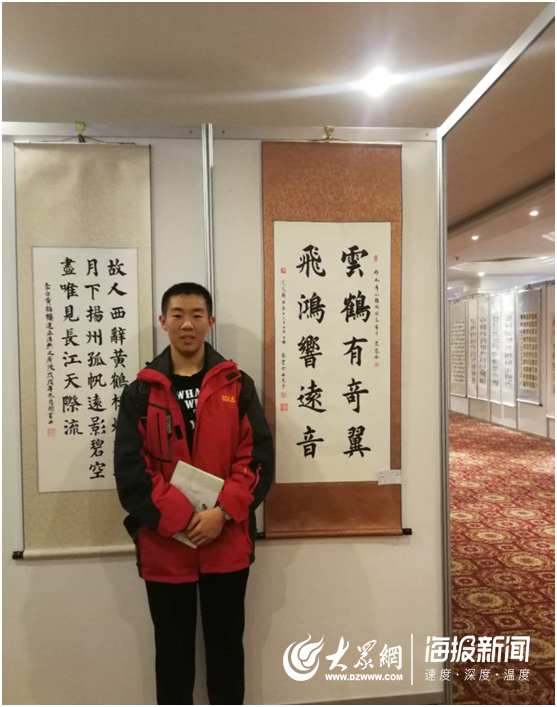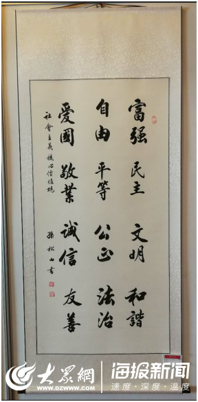 參展作者飽蘸著幸福與喜悅,用手中的筆濃墨重彩地謳歌改革開放的偉大成就,暢想偉大祖國的宏偉藍圖,齊聲奏響新時代的藝術(shù)篇章。退休老教師孫松山書寫了24字的社會主義核心價值觀,得到眾人一致點贊。招遠一中的高三學(xué)生丁旭亮也帶來兩幅作品參展。小丁從6歲開始學(xué)書法,現(xiàn)已小有所成。“課業(yè)閑暇時,寫寫字,可以舒緩緊張的學(xué)習(xí)生活,豐富自己的業(yè)余生活”,小丁告訴記者。