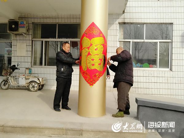 老人們為敬老院的門柱貼福字