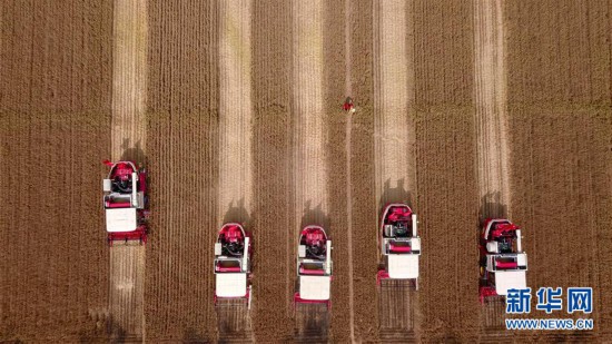 在山東省濟寧市嘉祥縣仲山鎮,工作人員操作收割機收割小麥(5月31日無人機拍攝)。 新華社記者 郭緒雷 攝