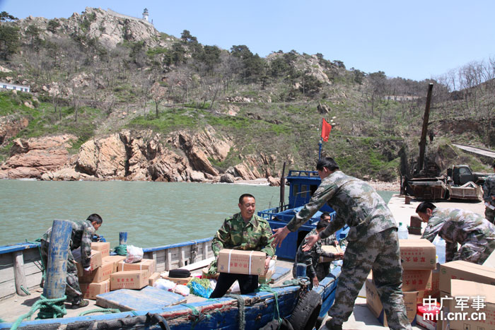 第四任船長錢福太把運(yùn)和官兵們一起送到海島的給養(yǎng)物資。 中廣軍事記者渠曉靜 攝