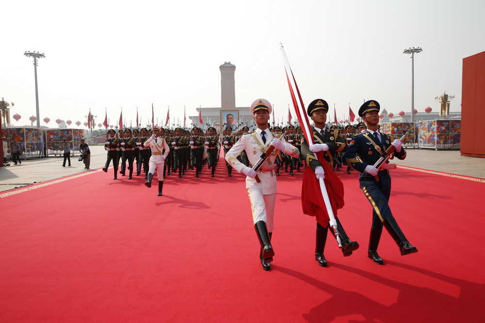 國旗護衛隊從人民英雄紀念碑基座出發,走向旗桿基座。新華社記者 費茂華 攝