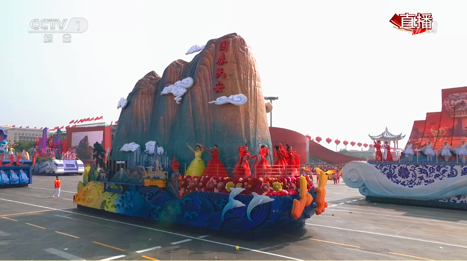 經(jīng)過現(xiàn)場檢驗(yàn)和調(diào)試,山東彩車于9月7日開始半裝演練。9月30日晚至10月1日凌晨,山東彩車進(jìn)入展演區(qū)域待命,在10月1日上午群眾游行環(huán)節(jié)正式亮相,向全國乃至全世界的網(wǎng)友呈現(xiàn)“國泰民安”的主題。