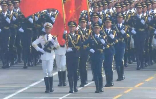 記者看到,儀仗方隊護衛黨旗、國旗、軍旗三面旗幟走在徒步方隊的最前方,引領受閱大軍接受檢閱。