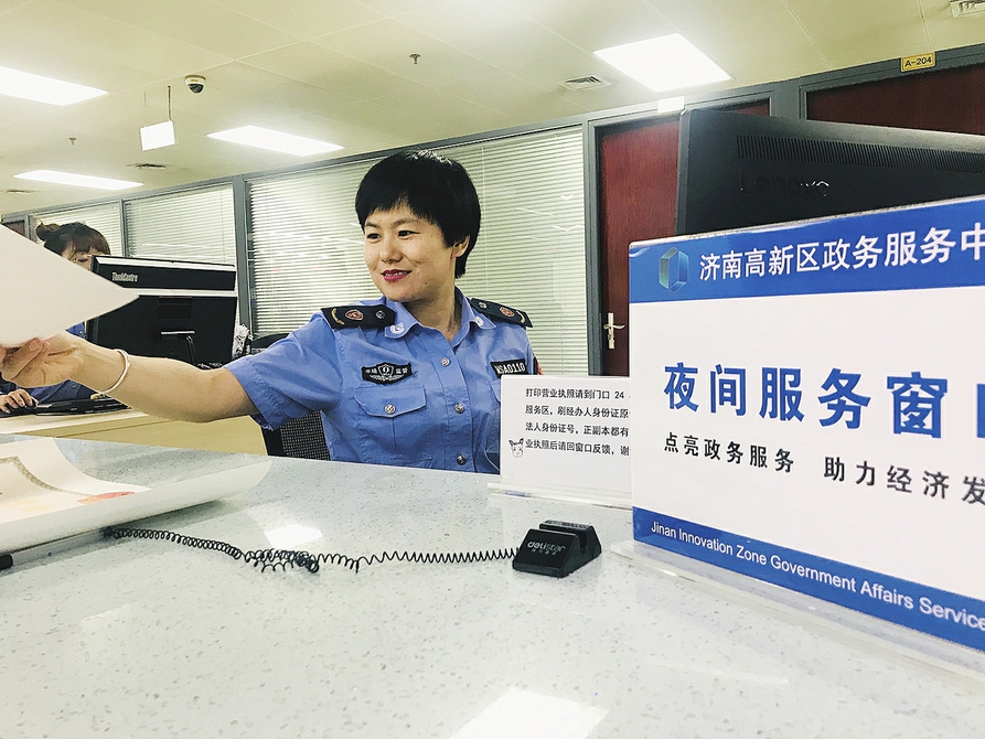 趙文珂向記者介紹,高新區繁華商圈比較多,像萬達、美蓮、雨滴廣場等商業中心,再加上齊魯軟件園,這些區域商戶很密集,業務辦理需求量比較大,為了在發展夜經濟的大環境中給商戶們提供便利,“夜間業務窗口”在半月前開通,辦理的業務主要是企業和個體工商戶的開辦登記等,服務時間是從18:00到22:00,每晚有兩名工作人員值班。“雖然規定服務時間是到晚上十點,但是如果客戶有需要,我們也可以延遲下班時間。”趙文珂說,從去年起,高新區市場監管局就利用“商事登記自助服務設備”在全市率先實現了自助服務“24小時不打烊”。今年4月份又全面啟動了“周末無休”商事登記,再加上這次推出的“夜間服務”,真正實現了“24×365”的服務機制。采訪間隙,一位商戶就通過24小時自助服務設備領取了營業執照。