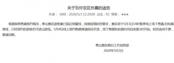 據泰山風景名勝區官方網站消息,今日,泰山景區假日工作指揮部發布通告稱,根據網絡售票預約情況,泰山景區游客量已接近預警線,按照疫情防控要求,景區將于5月3日14時暫停線上線下售票,但檢票繼續,已經預約的游客仍可進山游覽。 [詳細]
