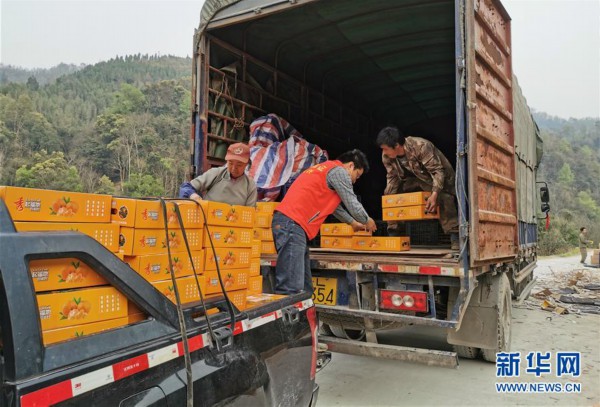 樂業縣百坭村駐村第一書記楊杰興(中)幫村民搬運農產品(2月26日攝)。 新華社記者 王念 攝