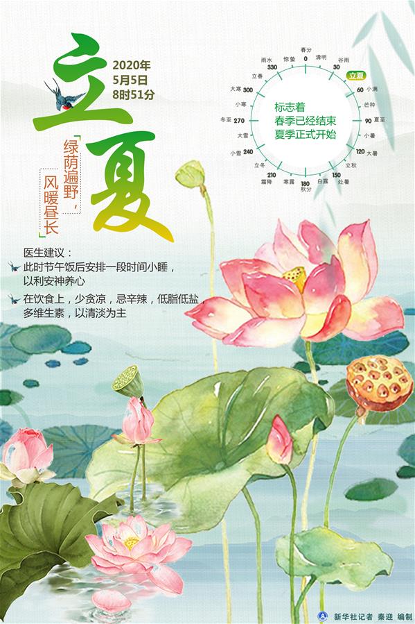 新華社天津5月3日電(記者周潤健)“忽驚夏向明朝立,便恐春從此地更。”《中國天文年歷》顯示,北京時間5月5日8時51分,迎來二十四節氣中的“立夏”,這一天在天文學上是告別春天、迎來夏日的轉折點,標志著春季已經結束,夏季正式開始。此時節,綠蔭遍野,風暖晝長,橫塘新荷,花叢蝶忙。