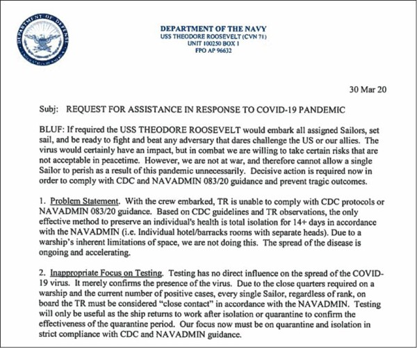“羅斯福”號航空母艦前任艦長的信件截圖