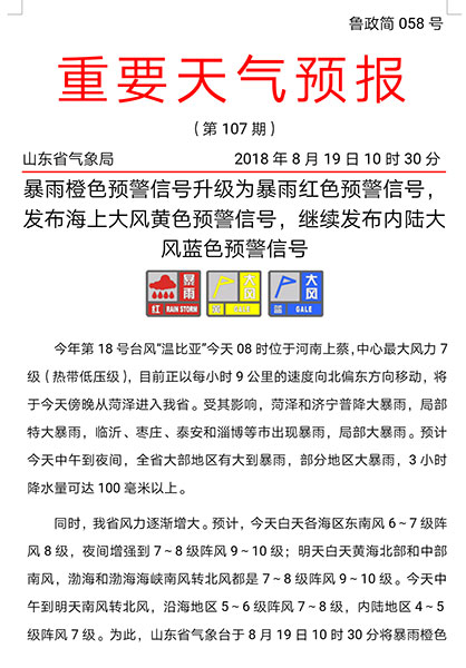 最新情況!據山東省氣象臺最新暴雨紅色預警,今年第18號臺風“溫比亞”今天08時位于河南上蔡,中心最大風力7級(熱帶低壓級),目前正以每小時9公里的速度向北偏東方向移動,將于今天傍晚從菏澤進入山東省。受其影響,菏澤和濟寧普降大暴雨,局部特大暴雨,臨沂、棗莊、泰安和淄博等市出現暴雨,局部大暴雨。預計今天中午到夜間,全省大部地區有大到暴雨,部分地區大暴雨,3小時降水量可達100毫米以上。為此,山東省氣象臺于8月19日10時30分將暴雨橙色預警信號升級為暴雨紅色預警信號。提醒大家做好防雨防汛措施!