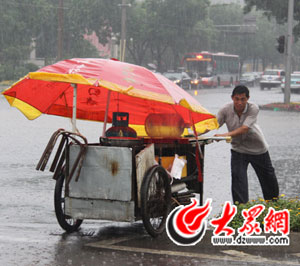 今天中午,市民劉先生相約和同事出門吃午飯,卻發(fā)現(xiàn)豆大的雨點(diǎn)從天而降,即便開著汽車開啟雨刷,但能見度依然很低。在歷山路、濼源大街上很多車輛打開應(yīng)急燈緩慢通行,沿街?jǐn)傸c(diǎn)冒雨收攤。