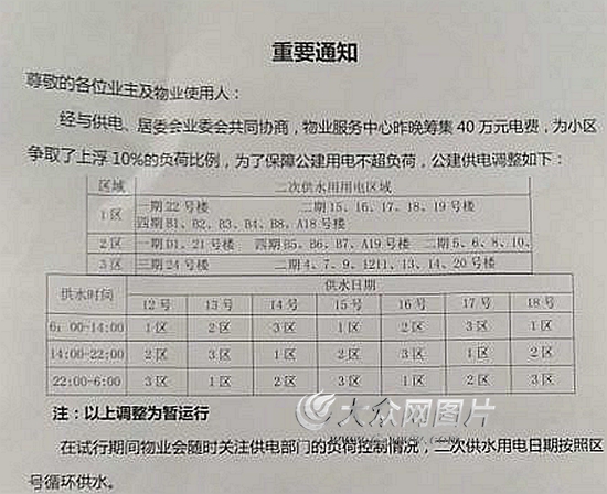 5月12日,小區物業對外稱,最近不少業主開始交納物業費,他們共籌措到40萬元電費,經過與供電部門協商,即日起公共用電負荷上調10%。即便是這樣,各居民樓供水供電依然要實行“三班倒”,這意味著居民每天享受供水的時間只有八小時。