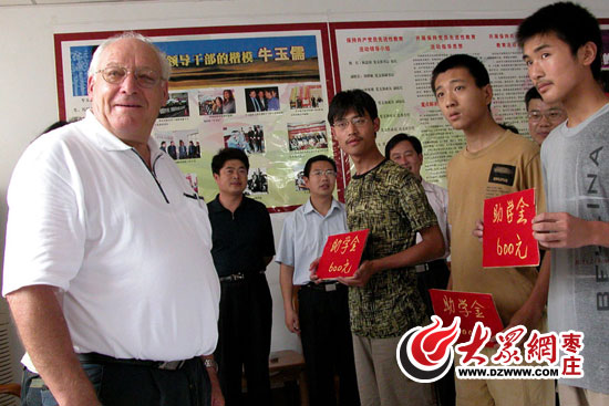 2005年7月29日,德國專家諾博先生為貧困生捐款。(資料圖)