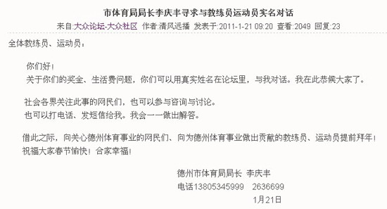 21日上午,一條名為“市體育局局長李慶豐尋求與教練員運動員實名對話”的帖子出現(xiàn)在了大眾網(wǎng)德州論壇,并引起網(wǎng)友關(guān)注。這條署名為“德州市體育局局長李慶豐”的帖子內(nèi)容也簡單明了:“全體教練員、運動員:你們好!關(guān)于你們的獎金、生活費問題,你們可以用真實姓名在論壇里,與我對話。我在此恭候大家了。社會各界關(guān)注此事的網(wǎng)民們,也可以參與咨詢與討論。也可以打電話、發(fā)短信給我。我會一一做出解答。”帖子最后,發(fā)帖者還公開了自己的辦公電話和手機號碼。 當(dāng)天記者撥打了德州市體育局電話,并查詢114號碼服務(wù)確認(rèn)發(fā)帖者公布的辦公電話確系德州市體育局局長李慶豐的號碼。22日,記者撥通了帖子上公布的電話,再次確認(rèn)發(fā)帖者正是德州市體育局局長。李慶豐局長向記者介紹了事情的經(jīng)過。