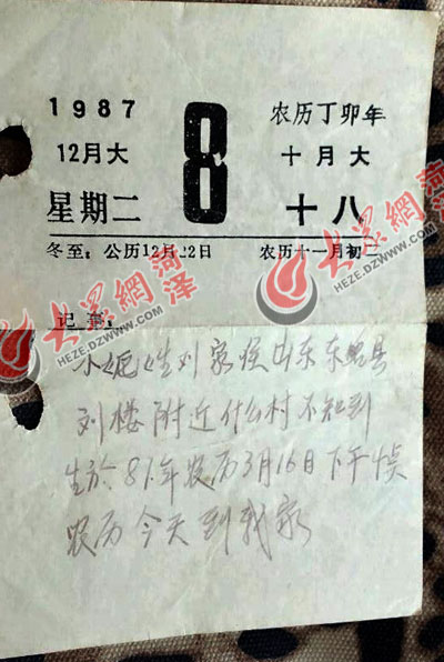 “小妮姓劉家住山東東名(明)縣劉樓附近什么村不知到(道),生于87年農歷3月16日下午4點,農歷今天到我家。”2006年,養父去世后,郭小妮發現了這張寫有自己身世的日歷表。從那一刻起,“尋親”這個念想便一直伴隨著郭小妮。 今年,郭小妮開始在網上到處尋找線索,并與大眾網記者取得聯系。據郭小妮介紹,生父姓劉,今年60歲左右,家住菏澤東明縣劉樓鎮,家里有2—3個女兒。當初生父家庭貧困加上女兒身體欠佳無力撫養,便送給了來東明工作的安徽人。
