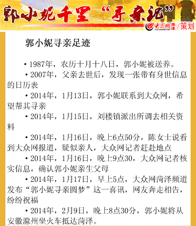 9日晚10點(diǎn)多,已經(jīng)坐上火車(chē)的郭小妮跟大眾網(wǎng)記者簡(jiǎn)短地聊了兩句。她說(shuō),回想起自己的尋親過(guò)程,現(xiàn)在終于要夢(mèng)想成真了,心里一直處于興奮、緊張的狀態(tài)。借此機(jī)會(huì),大眾網(wǎng)記者整理了一份郭小妮的尋親足跡表。