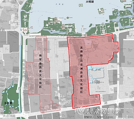 按照規(guī)劃,濟南的歷史文化街區(qū)是以居住、文化、商業(yè)、旅游等復(fù)合功能為主,形成具有濃厚的濟南傳統(tǒng)商業(yè)文化、城泉共生的泉水文化、廟會民俗文化特色的濟南古城的商業(yè)核心區(qū)。在保持街區(qū)居住功能為主的基礎(chǔ)上,下一步將在主要街巷水系兩側(cè),加大綠化面積,還原商鋪格局。同時細分功能區(qū),建立商業(yè)休閑區(qū)、濱水休閑文化區(qū)、宗教文化展示區(qū)、泉水文化體驗區(qū)、傳統(tǒng)民俗商業(yè)區(qū)、老字號商業(yè)區(qū)、傳統(tǒng)院落體驗區(qū)、旅游綜合服務(wù)區(qū)等,打造一張“濟南古城”的新名片。