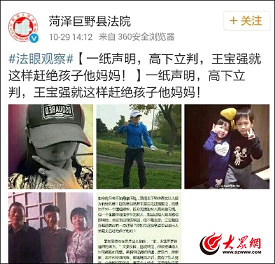 10月29日下午,疑似巨野縣人民法院的官微@菏澤巨野縣法院公開發表涉及王寶強婚變的言論,稱王寶強趕絕孩子他媽媽。