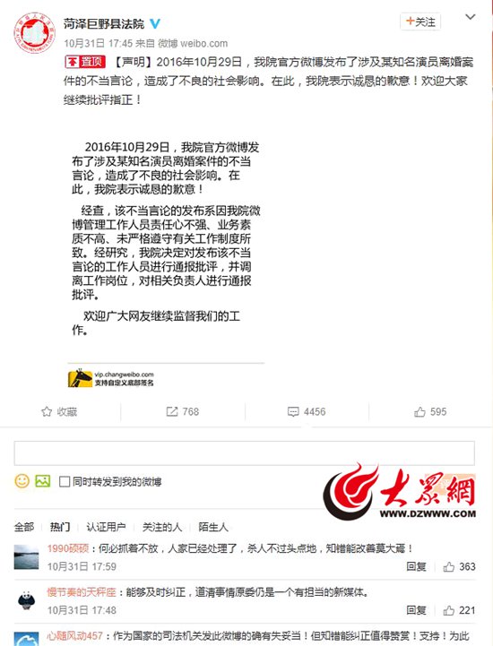 10月31日下午,@菏澤巨野縣法院就官微涉及明星離婚不當言論一事發布道歉聲明,發布言論的工作人員被調離工作崗位。
