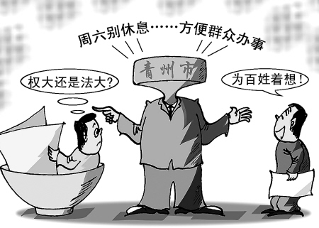 近日,山東省青州市出臺了一項新規定。該規定要求,青州市屬機關事業單位周六也要上班。“國家規定雙休,為何把這一規定更改?”一公務員說,他不理解在這件事情上,究竟是權大還是法大。4日,青州市市委宣傳部的一工作人員表示,青州確實是在試實行市屬機關事業單位周六上班的制度。執行這項制度的初衷是為了方便群眾辦事。... ...