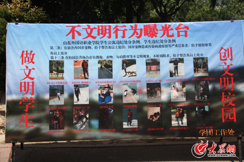 在展板頂部說明處罰的依據(jù)是根據(jù)山東外國(guó)語職業(yè)學(xué)院學(xué)生公寓違紀(jì)處分條例、學(xué)生違紀(jì)處分條例,其中第十三條規(guī)定,在校園公共場(chǎng)合存在摟抱、親吻、勾肩搭背等不文明現(xiàn)象、不聽勸阻者,給予警告及以上處分。展板落款為該校學(xué)團(tuán)工作處。