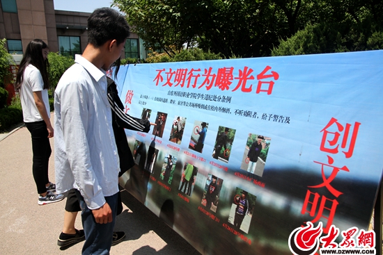 山東外國(guó)語職業(yè)學(xué)院學(xué)生在曝光臺(tái)前觀看各類不文明行為照片。