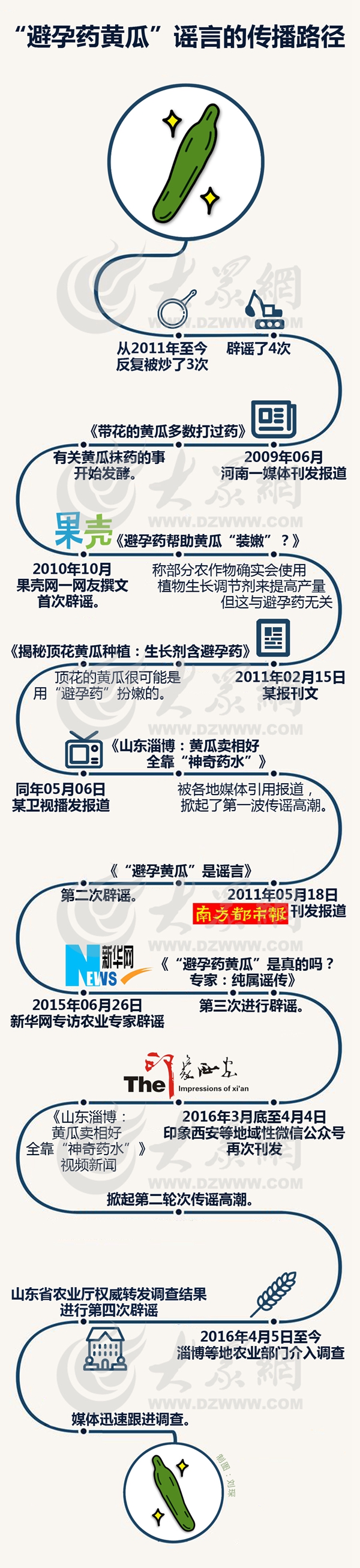 大眾網記者通過網上搜索后梳理發現,有關黃瓜涂抹“神奇藥水”(避孕藥)的傳言,從2011年至今,已反復被炒了三次,有關專家、部門和媒體辟謠四次。其具體傳播路徑如下: