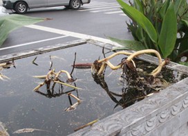 今天上午,大眾網記者來到了位于歷下區縣西巷的荷花集中擺放點。此處擺放的荷花是栽植于花箱中,每3個花箱為一組,其中中間的花箱內栽植荷花,兩側的花箱內栽植其他植物。大眾網記者數了一下,在縣西巷有22組這樣的箱載荷花。大眾網記者觀察發現,這22組箱載荷花在一場大雨之后,花箱中的荷花基本上都已凋落,只剩下了荷葉,更是有兩組已經死掉,連荷葉都不見了蹤影,只能看到花箱中殘留的藕還漂浮在水面上。