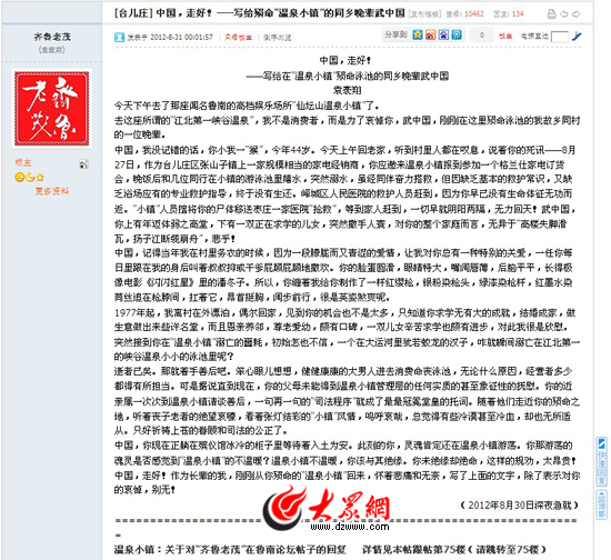 網友“齊魯老茂”在論壇中發表的悼念武中國的帖文。(大眾論壇頁面截圖)