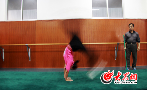 9月21日下午,記者來(lái)到山東省電影學(xué)校的練功房,該校2011級(jí)京劇班的學(xué)生正在上基訓(xùn)課,三個(gè)剛剛?cè)雽W(xué)的2011級(jí)京劇班女生朱釩萌、仉澤宇、楊雨辰正在壓腿,而這三個(gè)女生都是來(lái)自濟(jì)南的。其中,9歲的朱釩萌是育新小學(xué)的,12歲的仉澤宇是千佛山小學(xué)的,11歲的楊雨辰是歷下實(shí)驗(yàn)小學(xué)的,3個(gè)人都考上了山東省電影學(xué)校2011年的京劇班,而她們的目標(biāo)都是——“長(zhǎng)大了考中國(guó)戲曲學(xué)院,成為名角!”
