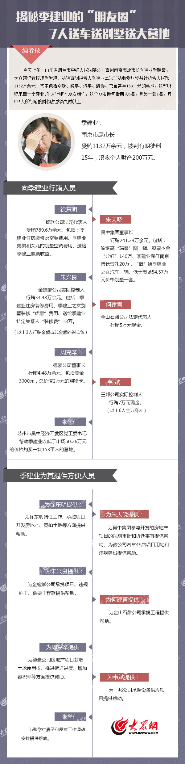 大眾網(wǎng)濟(jì)南4月7日訊(記者 馬俊驥)今天上午,山東省煙臺(tái)市中級(jí)人民法院公開(kāi)宣判南京市原市長(zhǎng)季建業(yè)受賄案。季建業(yè)一審被判有期徒刑15年,并沒(méi)收個(gè)人財(cái)產(chǎn)200萬(wàn)元。法院查明,被告人季建業(yè)21次非法收受財(cái)物共計(jì)折合人民幣1132萬(wàn)余元,包括別墅、股票、汽車(chē)、書(shū)畫(huà)等,還有153平米的墓地。這些財(cái)物來(lái)自于季建業(yè)的7人“朋友圈”。這個(gè)朋友圈包括商人6名、黨員干部1名。其中3人所行賄的財(cái)物占總額九成以上。