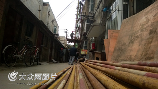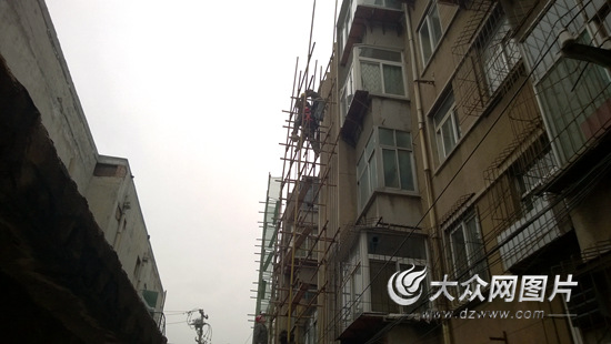 大眾網記者今天上午在現(xiàn)場看到,這棟居民樓第一單元的腳手架已經搭建完畢,幾名工人正在有條不紊地安裝第二單元的腳手架。現(xiàn)場工人告訴大眾網記者,他們是從昨天開始工作的,正在做居民樓維修前的準備。