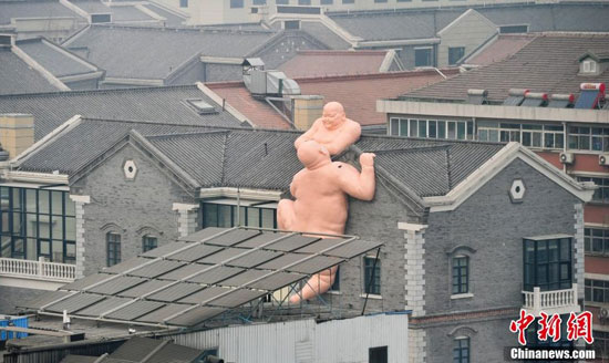 1月19日,中新網發布了濟南兩尊雕塑“爬墻”的圖片。(圖片來自中新網)