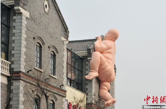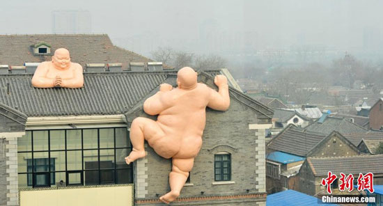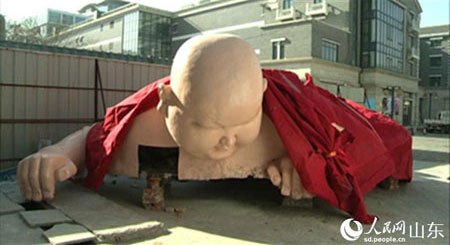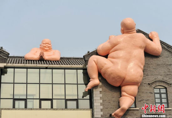 1月19日,中新網發了一組名為《攀房“裸佛”亮相濟南 似現實版“佛跳墻”》的圖片,圖片中,有兩個肉色的大型雕塑,一個“坐在”某兩層火鍋店的樓頂,一個攀附在墻上,做用力向上攀爬的姿勢。兩個雕塑造型都為年輕的胖子,其中坐在房頂的胖子有近三米高,雙手合十,耳垂飽滿,很像一尊佛;爬墻的“胖子”有近六米高。因為爬墻的“胖子”背面赤裸,所以在網絡轉載和評論中,有網友將這兩尊雕塑稱為“裸佛”。