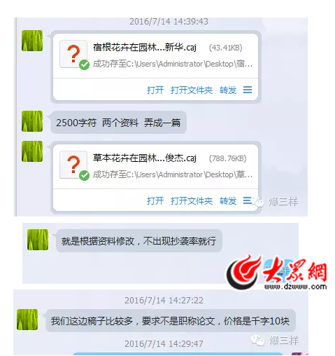 大眾網記者用網絡聊天工具聯系了該公司招聘人員,招聘人員介紹說,兼職論文寫手的主要工作是“根據資料修改,不出現抄襲率就行”,報酬是10元/千字。在應聘成功后,這名招聘人員發給了大眾網記者兩篇園林綠化方面的論文,要求將這兩篇論文“修改”成一篇2500字的“新”論文,并叮囑要對原文中一些語句 “換換說法”,騙過論文查重軟件。大眾網記者發現,這兩篇論文都是從中國知網付費(0.5元/頁)下載的,已分別于2008年3月和2015年2月在相關刊物上發表,作者分別來自新疆和河南。